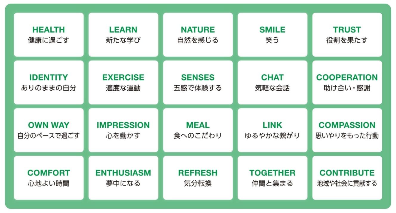 また1万人アンケート調査では、調査会社のアドバイスとともに15万人を対象とした過去の大規模調査なども参照し、石川善樹先生の監修を仰ぎながら、日常生活に関する意識・行動を網羅する104の項目を設定しました。そし、この調査結果から相関分析・因子分析を行い、ていねいにスクリーニングを進め、ウェルビーイングの向上につながる因子を絞り込んでいきました。表現する言葉にも検討を重ね、特定したのが、20種類のウェルビーイング向上因子です。このウェルビーイング向上因子を反映したサービス・機能が、いよいよ実装されていきます。