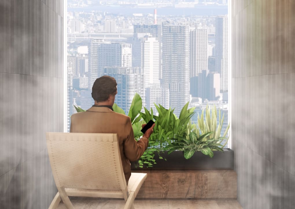 41階では、地上約190mから東京湾を一望できる心地よい空間「YAESU SKY LOUNGE」がワーカーを癒やします。ここには、全国の源泉を凝縮抽出・モバイル化するクラフト温泉の特許技術を持つLe Furo(ルフロ)と協業して、温泉ミストによる湯治体験が気軽にできる「喫泉室」を設けました。リフレッシュを促し、ワーカーのパフォーマンス向上をサポートします。