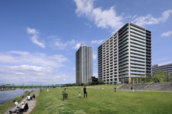 東京都多摩市の聖蹟桜ヶ丘北地区は、百貨店等の生活利便施設が集積する京王線「聖蹟桜ヶ丘」駅至近に位置し、多摩川沿いの豊かな自然も感じられるエリアです。一方、これまで、こうした地域の特徴が十分に利活用されていなかったことに加え、近年の災害激甚化を受けて、水害対策をはじめとした防災力向上が喫緊の課題となっていました。本取り組みは、気候変動自体を脱炭素社会の実現に向けた「機会」と捉え、土地区画整理事業・住商複合開発・エリアマネジメントそれぞれの取り組みによる課題解決を実現したものです。複数の事業主体(東京建物、東栄住宅、京王電鉄、伊藤忠都市開発、聖蹟桜ヶ丘エリマネ)が参画し、それぞれのノウハウを結集することで、分譲マンション開発敷地と隣接する河川区域を一体的に捉え、高規格堤防の基準に準拠した宅盤の整備や分譲マンションのZEH化をはじめとする、先進技術を随所に導入しました。