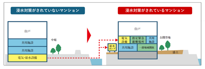 分譲マンションでは、令和元年東日本台風によるマンション地下階の浸水を教訓に、電気・給水設備を設計段階において設置を予定していた地下階から地上階へ変更する対策を行いました。こうした取り組みは、国土交通省・経済産業省の「建築物における電気設備の浸水対策ガイドライン(令和2年6月)」にタワーマンションで唯一の先進的事例として掲載されました。